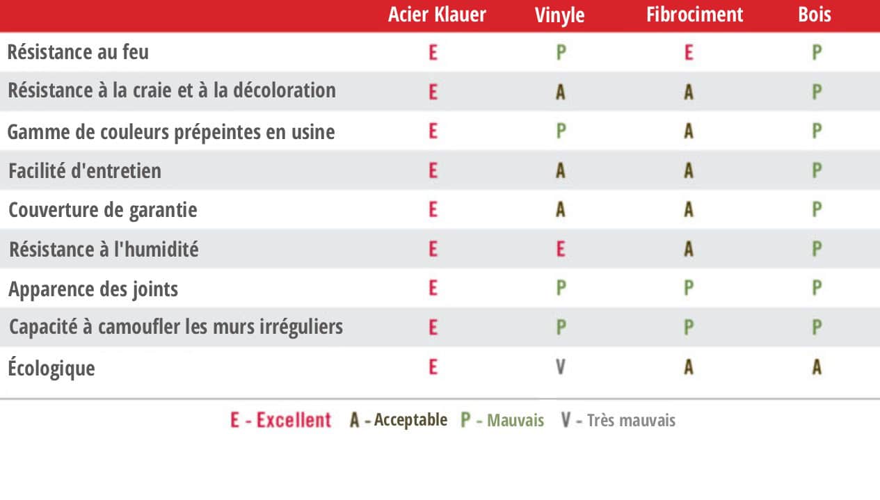 Le revêtement en acier Klauer Classic surpasse le vinyle, le fibrociment et le bois dans toutes les catégories essentielles, de la résistance au feu à l’impact environnemental. Toutes les données de ce tableau proviennent directement de Klauer Manufacturing. Pour plus de détails, veuillez consulter le dépliant du produit.
